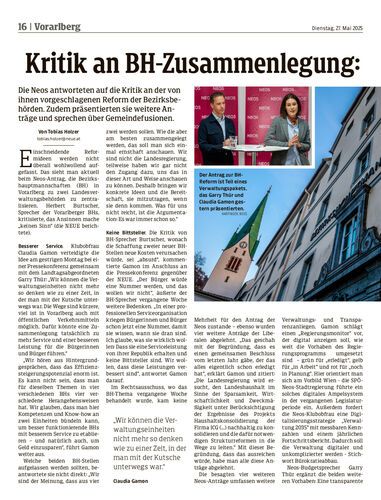 Die Neos antworteten auf die Kritik an der von ihnen vorgeschlagenen Reform der Bezirksbehörden. Zudem präsentierten sie weitere Anträge und sprechen über Gemeindefusionen.