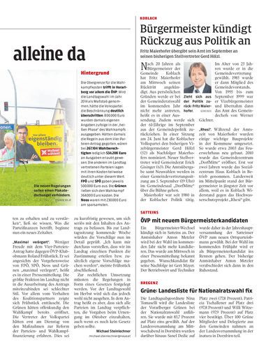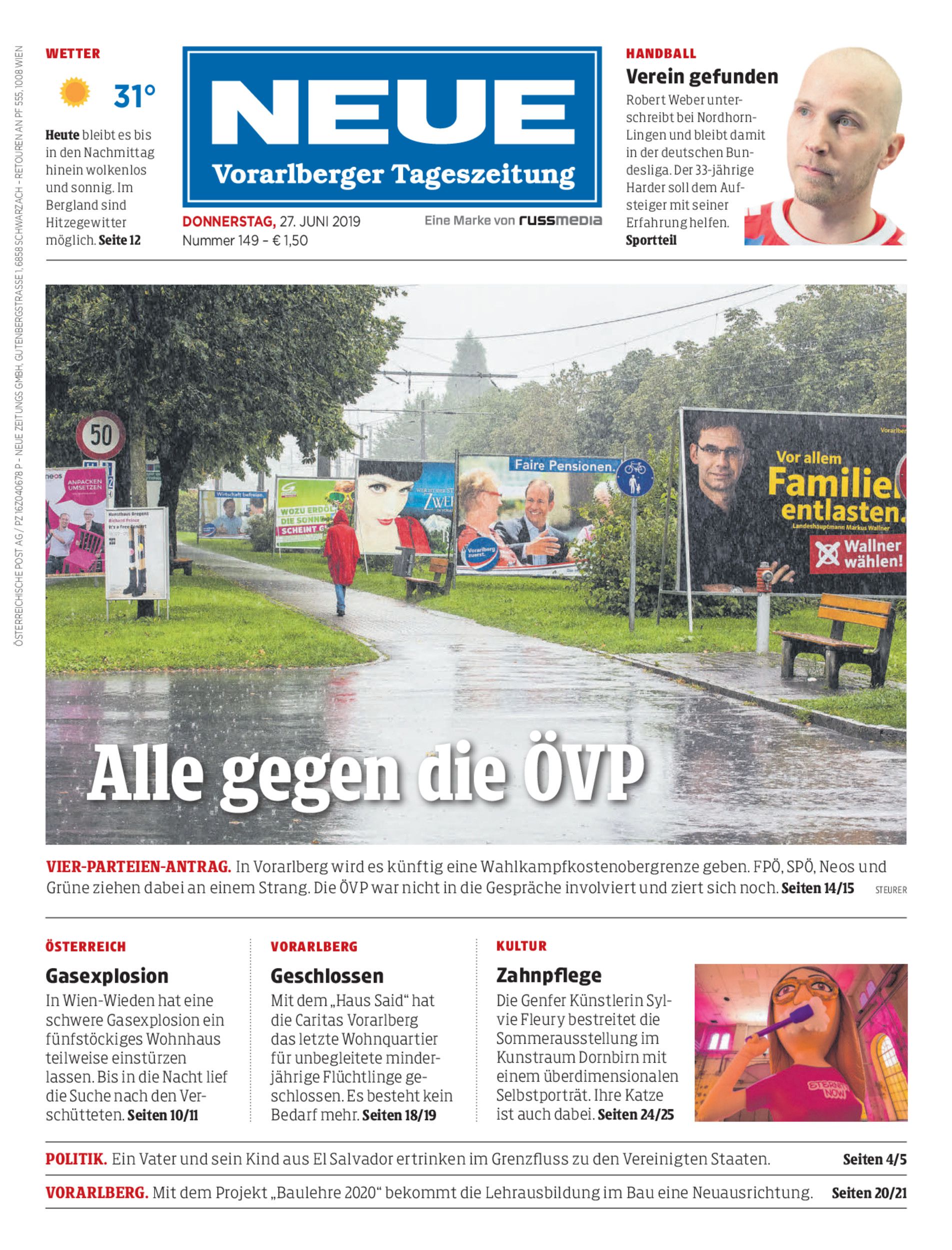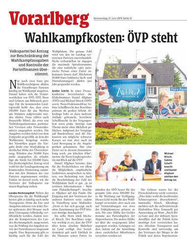 Vier-parteien-Antrag. In Vorarlberg wird es künftig eine Wahlkampfkostenobergrenze geben. FPÖ, SPÖ, Neos und Grüne ziehen dabei an einem Strang. Die ÖVP war nicht in die Gespräche involviert und ziert sich noch. Seiten 14/15 Steurer