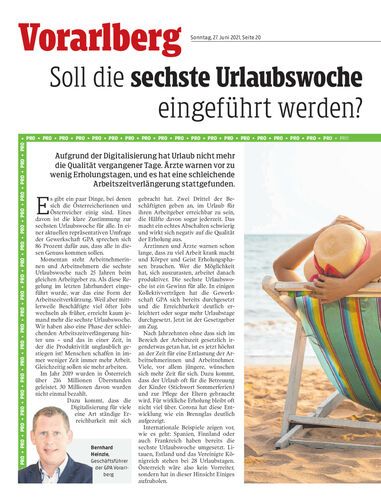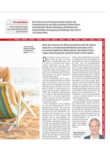 Eine Woche zusätzlichen Urlaub fordern die Gewerkschafter um GPA-Geschäftsführer Bernhard Heinzle. Martin Ohneberg, Präsident der Industriellenvereinigung Vorarlberg, hält nichts von dieser Idee.