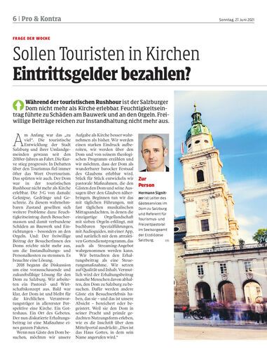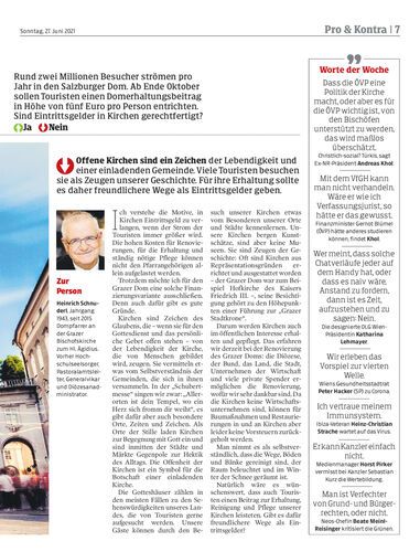 Rund zwei Millionen Besucher strömen pro Jahr in den Salzburger Dom. Ab Ende Oktober sollen Touristen einen Domerhaltungsbeitrag in Höhe von fünf Euro pro Person entrichten. Sind Eintrittsgelder in Kirchen gerechtfertigt?