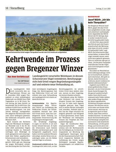Landesgericht verurteilte Weinbauer, in dessen Schutznetzen Vögel verendeten. Berufungsgericht hob Urteil wegen Begründungsmängeln auf und ordnete neue Verhandlung an.