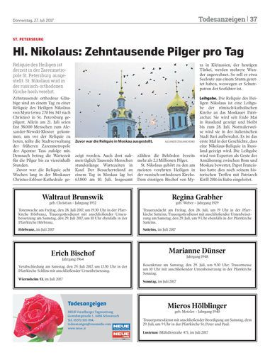 Reliquie des Heiligen ist derzeit in der Zarenmetropole St. Petersburg ausgestellt. St. Nikolaus wird in der russisch-orthodoxen Kirche hoch verehrt.