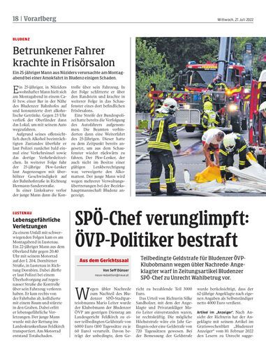 Teilbedingte Geldstrafe für Bludenzer ÖVP-Klubobmann wegen übler Nachrede: Angeklagter warf in Zeitungsartikel Bludenzer SPÖ-Chef zu Unrecht Wahlbetrug vor.