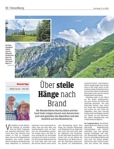 Die Wanderführer Hertha Glück und Gerhard Vylet steigen hinauf zum Amatschonjoch und genießen die Alpenflora und den Ausblick auf das Brandnertal.