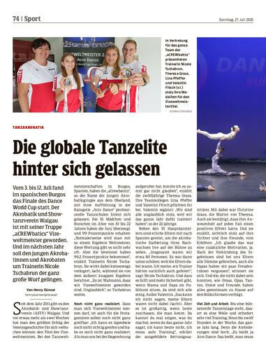 Vom 3. bis 12. Juli fand im spanischen Burgos das Finale des Dance World Cup statt. Der Akrobatik und Showtanzverein Walgau ist mit seiner Truppe „aCREWbatics“ Vizeweltmeister geworden. Und im nächsten Jahr soll den jungen Akrobatinnen und Akrobaten um Trainerin Nicole Tschabrun der ganz große Wurf gelingen.