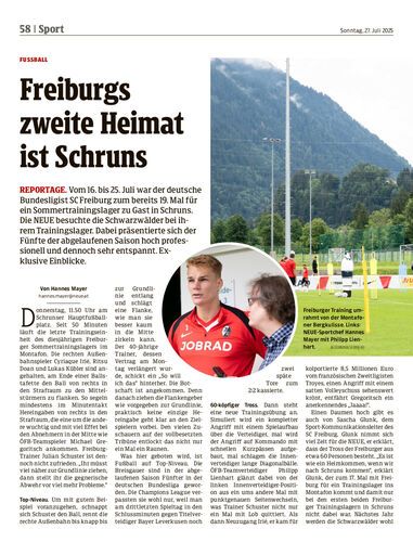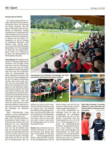 Reportage. Vom 16. bis 25. Juli war der deutsche Bundesligist SC Freiburg zum bereits 19. Mal für ein Sommertrainingslager zu Gast in Schruns. Die NEUE besuchte die Schwarzwälder bei ihrem Trainingslager. Dabei präsentierte sich der Fünfte der abgelaufenen Saison hoch professionell und dennoch sehr entspannt. Exklusive Einblicke.