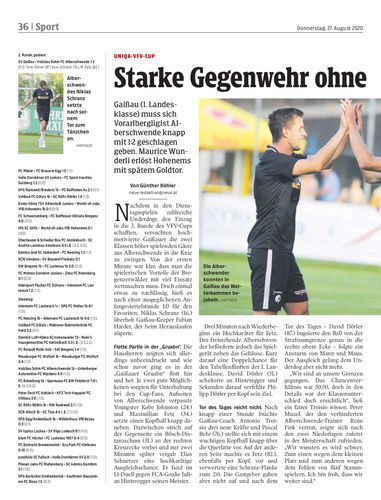 Gaißau (1. Landesklasse) muss sich Vorarlbergligist Alberschwende knapp mit 1:2 geschlagen geben. Maurice Wunderli erlöst Hohenems mit spätem Goldtor.