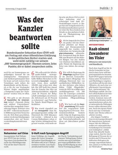 Bundeskanzler Sebastian Kurz (ÖVP) will am Freitag mit einer öffentlichen Erklärung in den politischen Herbst starten und, wohl nicht zufällig vor seinem „ORF-Sommergespräch“, Themen setzen. Zehn Punkte, die er dabei ansprechen sollte.