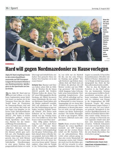 Alpla HC Hard empfängt heute in der ersten Qualifikationsrunde zur EHF European League HC Eurofarm Pelister 2 aus Nordmazedonien. Spielbeginn in der Sporthalle am See ist 19 Uhr.