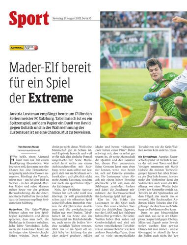 Austria Lustenau empfängt heute um 17 Uhr den Serienmeister FC Salzburg. Tabellarisch ist es ein Spitzenspiel, auf dem Papier ein Duell von David gegen Goliath und in der Wahrnehmung der Lustenauer ist es eine Chance, Mut zu beweisen.