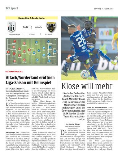 Die SPG SCR Altach/FFC Vorderland empfängt heute zum Bundesliga-Aufakt den FC Bergheim. Spielbeginn in der Cashpoint-Arena ist um 15.30 Uhr.