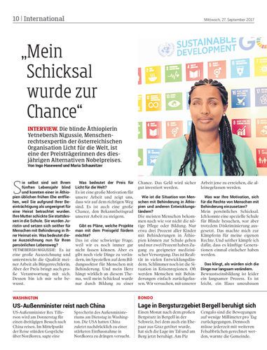 Die blinde Äthiopierin Yetnebersh Nigussie, Menschenrechtsexpertin der österreichischen Organisation Licht für die Welt, ist eine der Preisträgerinnen des diesjährigen Alternativen Nobelpreises. Von Ingo Hasewend und Maria Schaunitzer