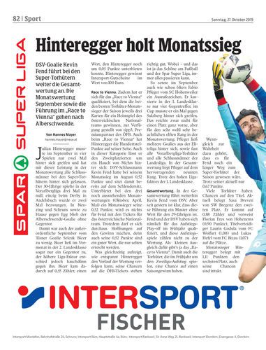 DSV-Goalie Kevin Fend führt bei den Super-Torhütern weiter die Gesamtwertung an. Die Monatswertung September sowie die Führung im „Race to Vienna“ gehen nach Alberschwende.