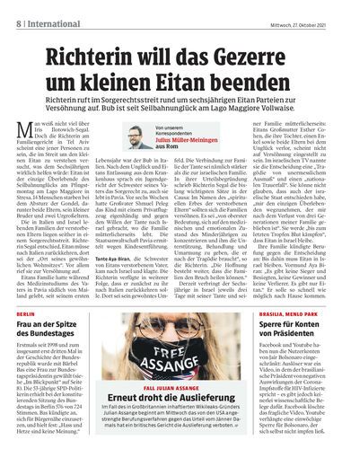 Richterin ruft im Sorgerechtsstreit rund um sechsjährigen Eitan Parteien zur Versöhnung auf. Bub ist seit Seilbahnunglück am Lago Maggiore Vollwaise.