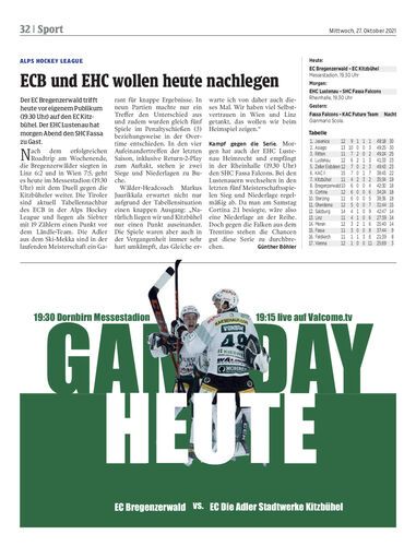 Der EC Bregenzerwald trifft heute vor eigenem Publikum (19.30 Uhr) auf den EC Kitzbühel. Der EHC Lustenau hat morgen Abend den SHC Fassa zu Gast.