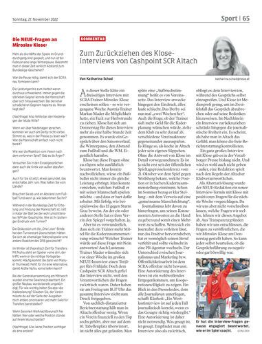 Essay. Die NEUE hat am Donnerstag ein Interview mit Altach-Trainer Miroslav Klose geführt, das heute erscheinen sollte. Auf Verlangen des Vereins legte die Redaktion nach wortgetreuer Gesprächsabschrift dem SCRA das Interview zur Freigabe vor. Die Altacher bewerteten die gestellten Fragen als zu kritisch und verweigerten die Freigabe des gesamten Interviews.