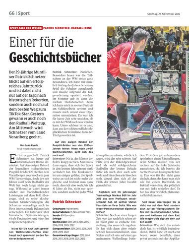 Der 29-jährige Muntlixer Patrick Schnetzer blickt auf ein erfolgreiches Jahr zurück und ist dabei nicht nur auf der Jagd nach historischen Rekorden, sondern auch noch auf dem besten Weg zum TikTok-Star. Gestern gewann er auch noch den Radball-Weltcup. Am Mittwoch wird Schnetzer vom Land Vorarlberg geehrt.