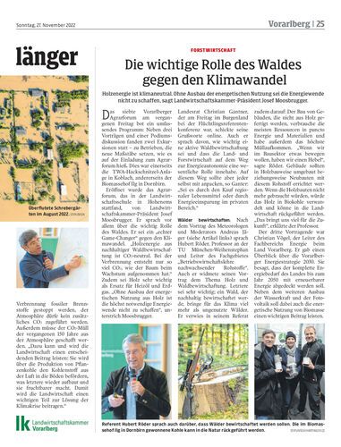 Holzenergie ist klimaneutral. Ohne Ausbau der energetischen Nutzung sei die Energiewende nicht zu schaffen, sagt Landwirtschaftskammer-Präsident Josef Moosbrugger.