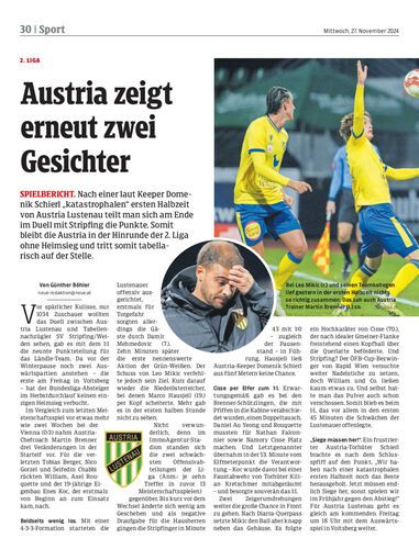 Spielbericht. Nach einer laut Keeper Domenik Schierl „katastrophalen“ ersten Halbzeit von Austria Lustenau teilt man sich am Ende im Duell mit Stripfing die Punkte. Somit bleibt die Austria in der Hinrunde der 2. Liga ohne Heimsieg und tritt somit tabellarisch auf der Stelle.