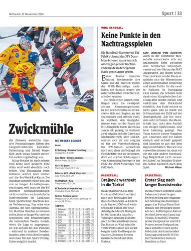 Die Pioneers Vorarlberg gastieren heute (19.15 Uhr) bei Meister Salzburg. Es ist der Auftakt einer anspruchsvollen Spielwoche. Am Wochenende gastieren Graz und Villach in der Vorarlberghalle.