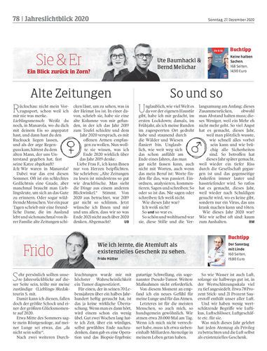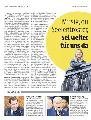 Ob nun beseelte Laien am Balkon zur Gitarre griffen, Startenöre am Fenster stehend ein „Ave Maria“ in die Welt hinausschickten, Orchestermusiker Bach-Partituren erklingen ließen oder Bands online ihre Konzerte gaben: Auch Musik führte uns durch pandemische Wirrnisse im restlos verpeilten Jahr 2020. Von Thomas Golser