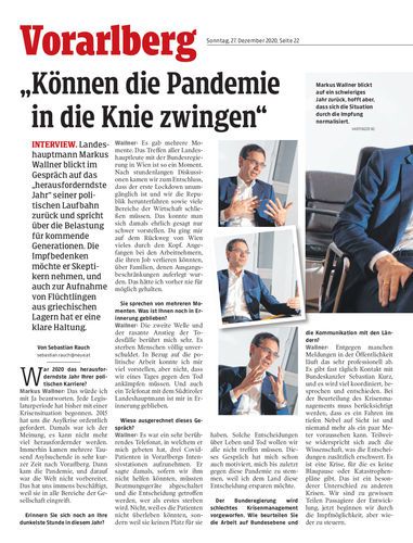 Interview. Landeshauptmann Markus Wallner blickt im Gespräch auf das „herausforderndste Jahr“ seiner politischen Laufbahn zurück und spricht über die Belastung für kommende Generationen. Die Impfbedenken möchte er Skeptikern nehmen, und auch zur Aufnahme von Flüchtlingen aus griechischen Lagern hat er eine klare Haltung.