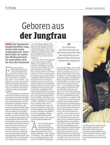 ESSAY. Die Tugend der Jungfräulichkeit mag heute nicht mehr zeitgemäß sein. Trotzdem wirkt sie weiter. Das Weihnachtsfest ist wesentlich auch ein Fest der Unschuld.