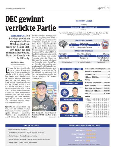 Spielbericht. Die Bulldogs gewinnen ein spektakuläres Match gegen Innsbruck mit 7:4 und klettern damit auf den fünften Tabellenrang. Mann des Abends war Emil Romig.