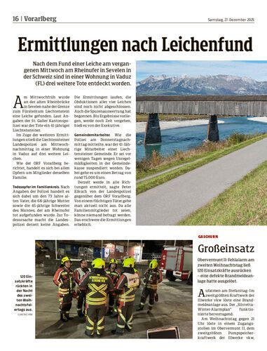 Nach dem Fund einer Leiche am vergan-genen Mittwoch am Rheinufer in Sevelen in der Schweiz sind in einer Wohnung in Vaduz (FL) drei weitere Tote entdeckt worden.