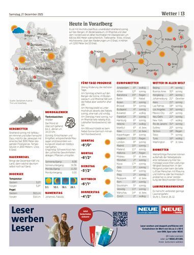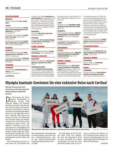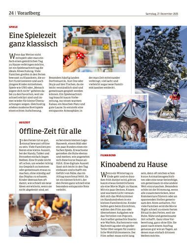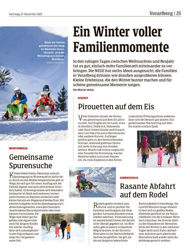 In den ruhigen Tagen zwischen Weihnachten und Neujahr tut es gut, einfach mehr Familienzeit miteinander zu verbringen. Die NEUE hat sechs Ideen ausgesucht, die Familien in Vorarlberg drinnen wie draußen ausprobieren können. Kleine Erlebnisse, die den Winter bunter machen und für schöne gemeinsame Momente sorgen.
