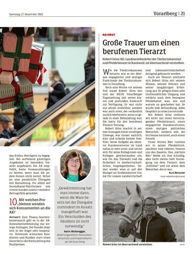 Robert Griss (61), Landesstellenleiter der Tierärztekammer und Pferdetierarzt in Rankweil, ist überraschend verstorben.