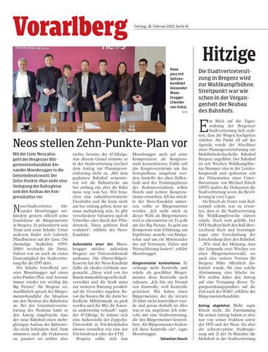 Mit der Liste Neos plus geht der Bregenzer Bürgermeisterkandidat Alexander Moosbrugger in die Gemeinderatswahl. Der Zehn-Punkte-Plan sieht eine Verlegung der Bahngleise und den Ausbau der Kongresskultur vor.