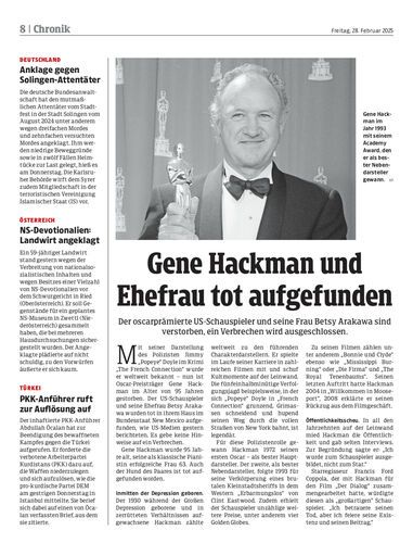 Der oscarprämierte US-Schauspieler und seine Frau Betsy Arakawa sind verstorben, ein Verbrechen wird ausgeschlossen.
