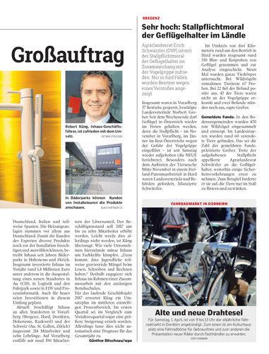 Agrarlandesrat Erich Schwärzler (ÖVP) ist mit der Stallpflichtmoral der Geflügelhalter im Zusammenhang mit der Vogelgrippe zufrieden. Nur in fünf Fällen wurden Besitzer wegen eines Verstoßes angezeigt.