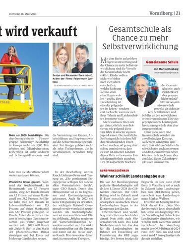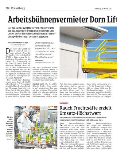 Bei der Bundeswettbewerbsbehörde wurde die beabsichtigte Übernahme der Dorn Lift GmbH durch die oberösterreichische Firmengruppe Felbermayr bekannt gegeben.
