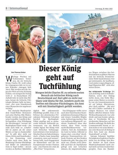 Morgen bricht Charles III. zu seinem ersten Besuch als britischer König nach Deutschland auf. Dort gibt es nicht nur Glanz und Gloria für ihn, sondern auch ein Treffen mit Ukraine-Flüchtlingen. Ein Amt will mit Sinnhaftigkeit gefüllt werden.