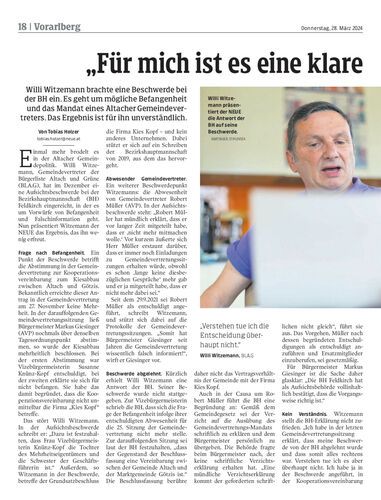 Willi Witzemann brachte eine Beschwerde bei der BH ein. Es geht um mögliche Befangenheit und das Mandat eines Altacher Gemeindevertreters. Das Ergebnis ist für ihn unverständlich.