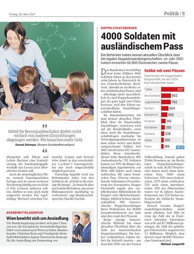 Die Behörden haben keinen aktuellen Überblick über die legalen Doppelstaatsbürgerschaften. Im Jahr 2001 hatten immerhin 55.000 Österreicher zweite Pässe.