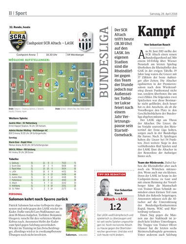 Der SCR Altach trifft heute (18.30 Uhr) auf den LASK. Im eigenen Stadion sind die Rheindörfler gegen das Team der Stunde jedoch nur Außenseiter. Torhüter Lukse feiert nach einem Jahr Verletzungspause sein Startelf-Comeback.