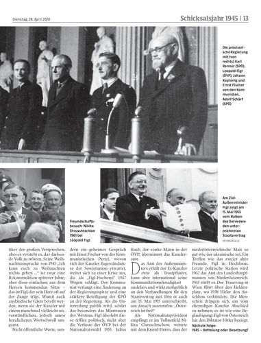 Nach Jahren im Konzentrationslager inhaftiert, erst am 6. April 1945 der Todeszelle entkommen, gehört Leopold Figl schon am 27. April der provisorischen Regierung an. Im Dezember wird er der erste Bundeskanzler der Zweiten Republik. Figl, die Symbolfigur für das Ringen Österreichs um das Überleben und die Freiheit. Von Christian Weniger