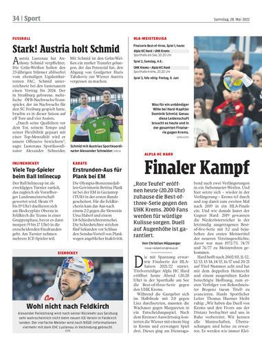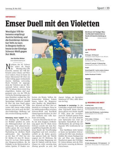 Westligist VfB Hohenems empfängt Austria Salzburg, und die Dornbirner Admira hat Telfs zu Gast. In Bregenz heißt es heute in der Eliteliga Schwarz-Weiß gegen Rot-Weiß.