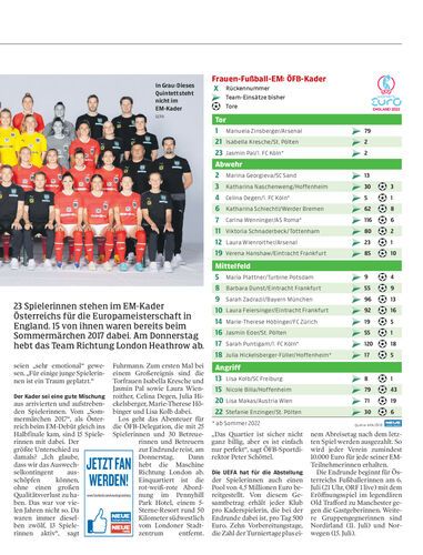 23 Spielerinnen stehen im EM-Kader Österreichs für die Europameisterschaft in England. 15 von ihnen waren bereits beim Sommermärchen 2017 dabei. Am Donnerstag hebt das Team Richtung London Heathrow ab.