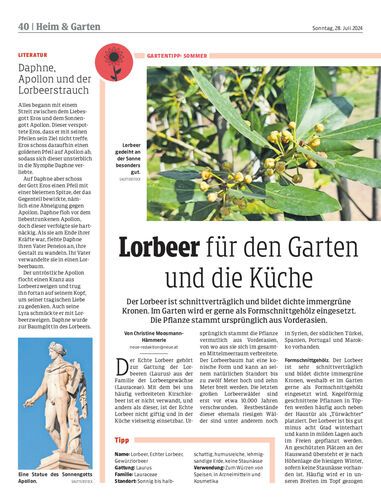 Der Lorbeer ist schnittverträglich und bildet dichte immergrüne Kronen. Im Garten wird er gerne als Formschnittgehölz eingesetzt. Die Pflanze stammt ursprünglich aus Vorderasien.
