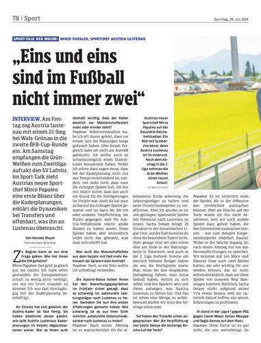 Interview. Am Freitag zog Austria Lustenau mit einem 2:1-Sieg bei Wals-Grünau in die zweite ÖFB-Cup-Runde ein. Am Samstag empfangen die Grün-Weißen zum Zweitligaauftakt den SV Lafnitz. Im Sport-Talk zieht Austrias neuer Sportchef Mirco Papaleo eine erste Bilanz über die Kaderplanungen, erklärt die Dynamiken bei Transfers und offenbart, was ihn an Lustenau überrascht.