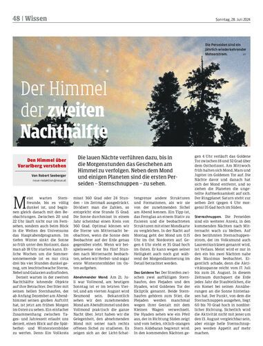 Die lauen Nächte verführen dazu, bis in die Morgenstunden das Geschehen am Himmel zu verfolgen. Neben dem Mond und einigen Planeten sind die ersten Perseiden – Sternschnuppen – zu sehen.