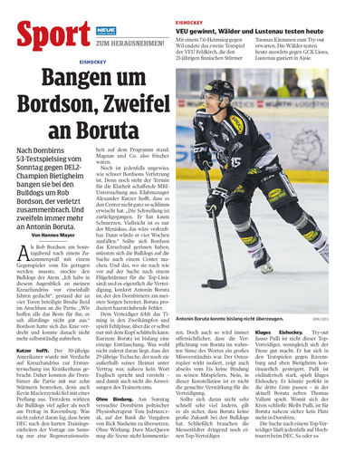 Nach Dornbirns 5:3-Testspielsieg vom Sonntag gegen DEL2-Champion Bietigheim bangen sie bei den Bulldogs um Rob Bordson, der verletzt zusammenbrach. Und zweifeln immer mehr an Antonin Boruta.