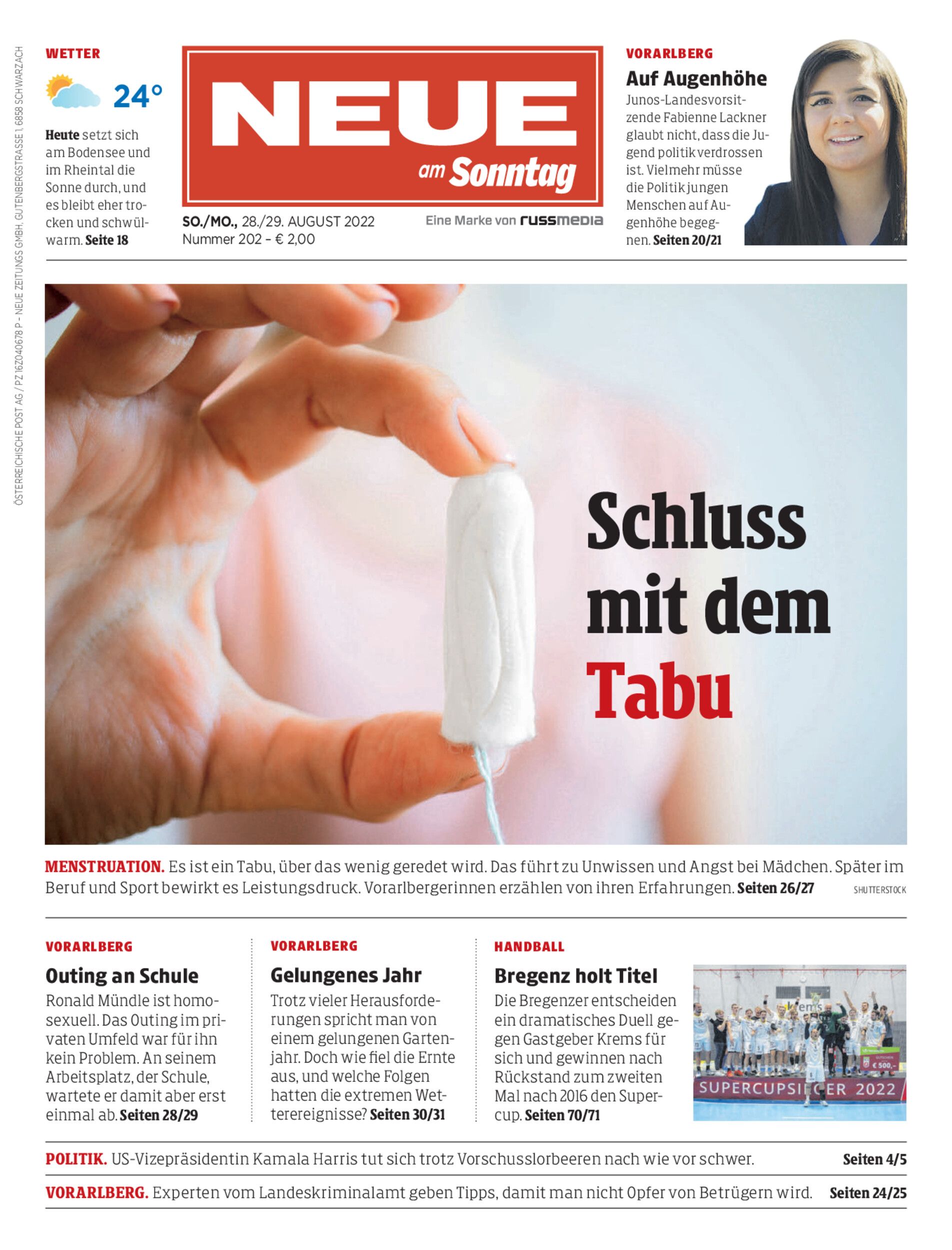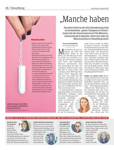 Einzelne Schritte der Enttabuisierung sind zu beobachten: gratis Tampons in Schottland und ein Gesetzesentwurf für Menstruationsurlaub in Spanien. Doch wie tabu ist Menstruation in Vorarlberg noch?