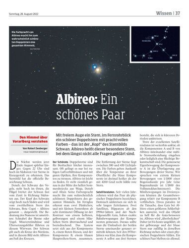 Mit freiem Auge ein Stern, im Fernrohrblick ein schöner Doppelstern mit prachtvollen Farben – das ist der „Kopf“ des Sternbilds Schwan. Albireo heißt dieser besondere Stern, bei dem längst nicht alle Fragen geklärt sind.