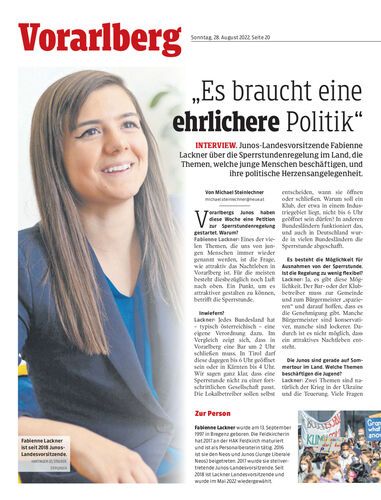 Interview. Junos-Landesvorsitzende Fabienne Lackner über die Sperrstundenregelung im Land, die Themen, welche junge Menschen beschäftigen, und ihre politische Herzensangelegenheit.