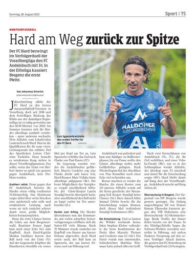 Der FC Hard bezwingt im Verfolgerduell der Vorarlbergliga den FC Andelsbuch mit 3:1. In der Eliteliga kassiert Bregenz die erste Pleite.